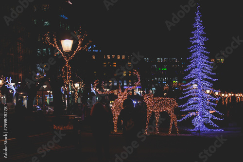 Christmas decorations in the historical center streets of Helsinki, with evening light illumination, concept of Christmas in Finland, with Cathedral, market square, christmas tree
