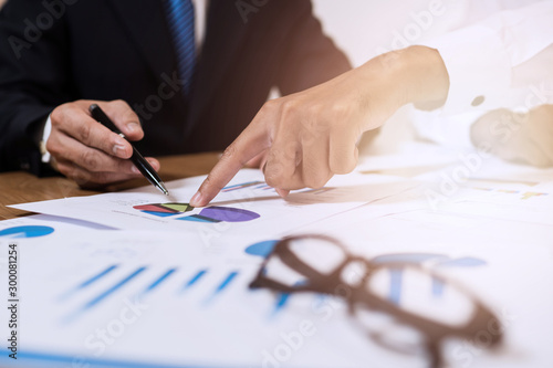 Group of marketing team anlayst and planning finance by looking at business chart paper in office