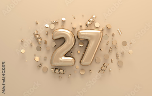 Golden 3d number 27 with festive confetti and spiral ribbons. Poster template for celebrating 27 anniversary event party. 3d render