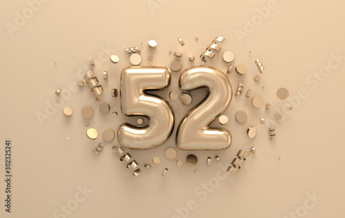 Golden 3d number 52 with festive confetti and spiral ribbons. Poster template for celebrating 52 aniversary event party. 3d render