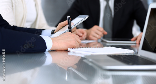 Business people discussing contract working together at meeting at the glass desk in modern office. Unknown businessman and woman with colleagues or lawyers at negotiation. Teamwork and partnership