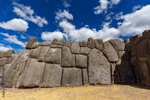Image of llamas on a stone wall of Sacsayhuaman. Cusco, Peru.