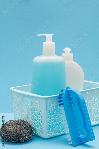 Bottles of dishwashing liquid in basket and brush on blue background.