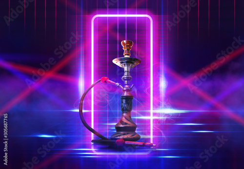 Hookah with smoke on a background of an empty abstract scene. Reflection of neon lights