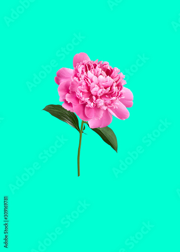Spring and summer floral holiday design with pink peony isolated on aqua menthe background, copy space, closeup, creative festive mothers or womens day concept