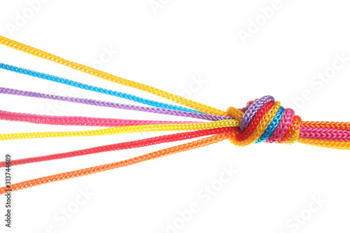 Colorful ropes tied together with knot isolated on white. Unity concept