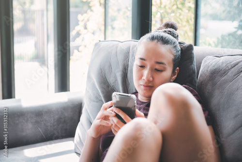 beautiful asian woman using smartphone on the sofa relaxing corner in her house.