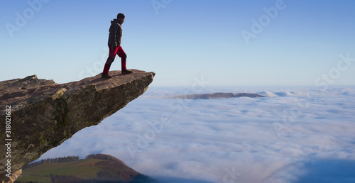 man standing on the cliff above the mountains and clouds