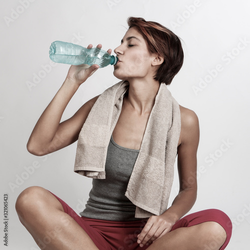 bella ragazza sportiva con il caschetto beve acqua dalla bottiglia dopo aver fatto sport, isolata su sfondo bianco