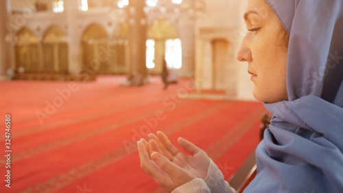 thoughtful woman in blue headscarf prays holding hand palms up standing in ancient mosque extreme copyspace