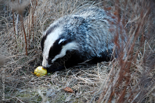 Borsuk je żółte jabłko w zmrożonych suchych trawach na brzegu