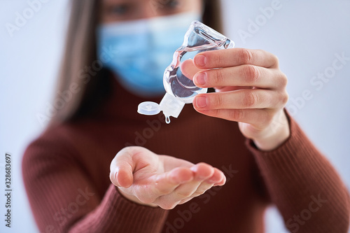 Woman in medical protective mask applying an antibacterial antiseptic gel for hands disinfection and health protection during during flu virus outbreak. Coronavirus quarantine and novel covid ncov