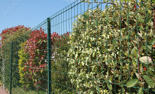 Clôture en grillage et haie de végétaux variés