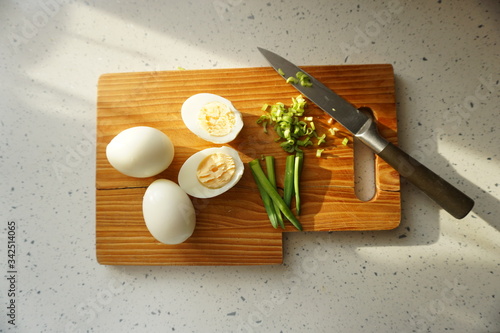 Przygotowania do śniadania jajka na twardo że szczypiorkiem