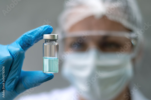 Biology and science. Scientist holding a vaccine vial. Global alert. Vaccination. Covid-19. Coronavirus. Research.