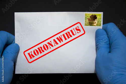 Ludzkie ręce w rękawicach ochronnych z listem, który może zawierać wirusa COVID-19. Przesyłki pocztowe mogą rozprzestrzeniać koronawirusa.