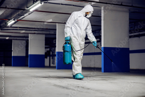 Worker in sterile uniform and mask walking trough underground garage and sterilizing surface. Protection from corona virus / covid-19 concept.