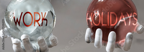 holidays and work in a balanced life - pictured as words holidays,work in hands to show that work and holidays should stay in balance, 3d illustration