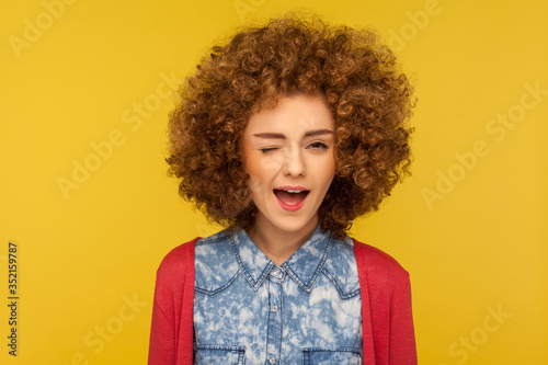 Closeup portrait of playful happy charming woman with curly hair in casual outfit blinking eye as having cunning idea, winking and flirting to camera. indoor studio shot isolated on yellow background