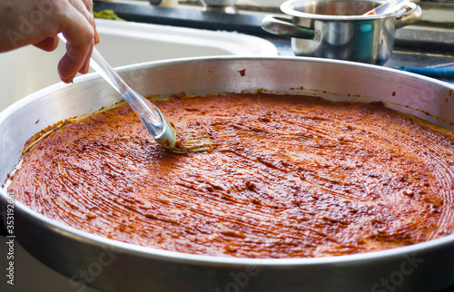 Woman cook hand spreading sauce on pizza. Chef put sauce on pizza.