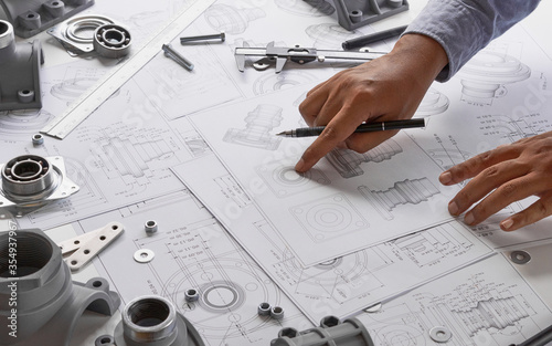 Engineer technician designing drawings mechanical parts engineering Engine.manufacturing factory Industry Industrial work project blueprints measuring bearings caliper tools