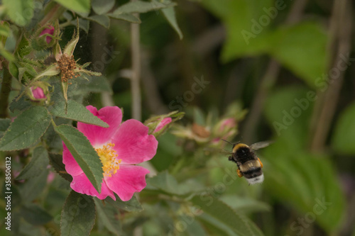 Owady zbierające nektar z kwiatów dzikiej róży.