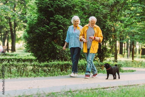 Selective focus of cheerful senior couple with pug dog on leash strolling in park at summer