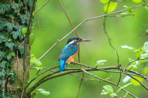 Zimorodek zwyczajny Alcedo atthis odpoczywa na gałęzi, kolorowy ptak, który łowi ryby