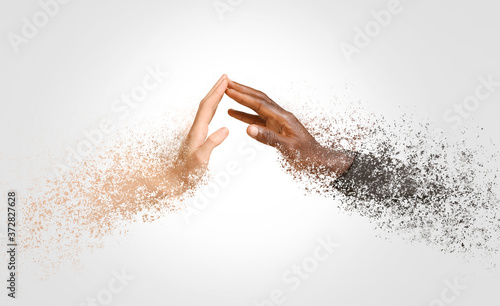Hands of Caucasian woman and African-American man reaching out to each other on color background. Racism concept