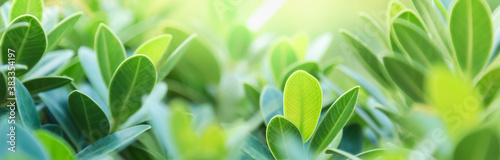 Closeup of green leaf on blurred greenery background in garden with bokeh and copy space using as background cover page concept.