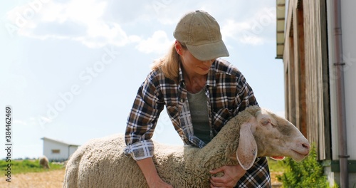 Caucasian pretty young woman shepherd holding sheep and petting it outdoors. Beautiful female farmer caressing and stroking animal. Livestock farming concept. Outdoors.