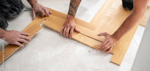 ein neuer Fußbodenbelag aus Fischgräten Eichen Stäben entsteht