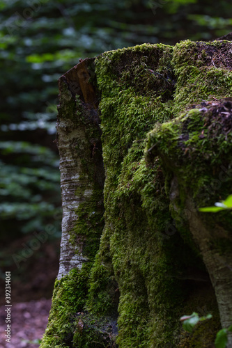 Fragment pnia zrąbanego drzewa porośniętego mchem i porostami
