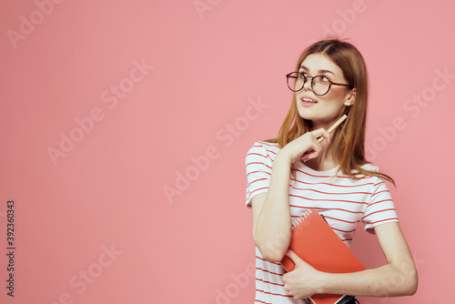 beautiful female student holding books education institute gesturing with hands pink background Copy Space