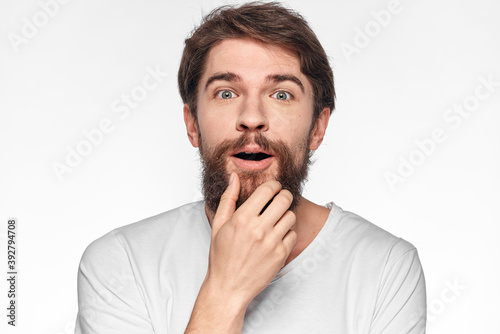 cheerful bearded man in a white t-shirt emotions gestures with his hands light background studio