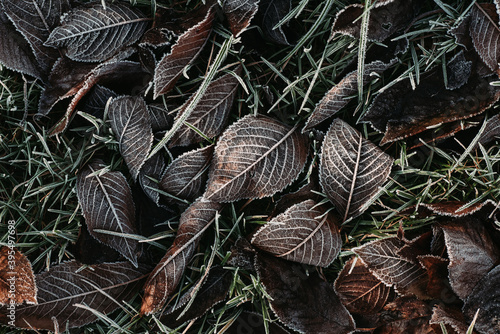 Detailed close up of frozen leaf early in the morning in winter