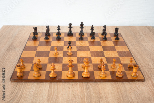 Chessboard with pieces. Arrangement of the pieces stems from an opening known as Queen's Gambit.