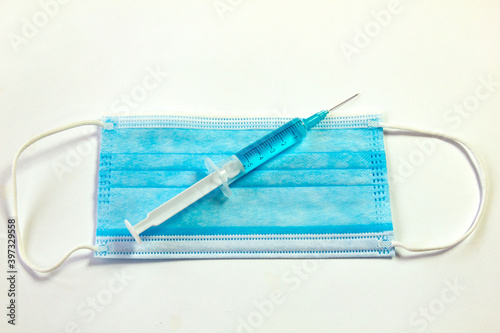 Maseczka chirurgiczna i strzykawka na białym tle. Motyw szczepienia przeciwko Covid-19