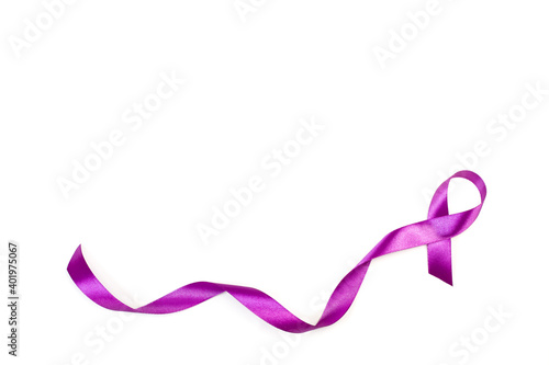 Lazo morado sobre un fondo blanco liso y aislado. Vista superior. Copy space. Concepto: Cancer. Causas solidarias. Enfermedades