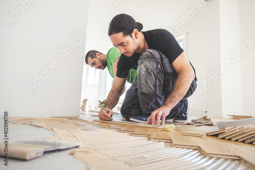 Parkettleger legen einen Eichen Fischgrät Parkett