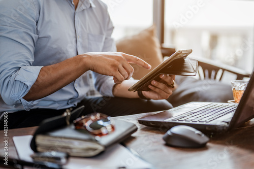 Businessman using tablet with laptop and pen on wooden table in coffee shop..Business and working concept