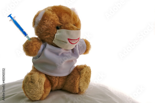 Pluszowy miś na białym tle w maseczce nawiązujący do szczepień przeciwko Covid-19.