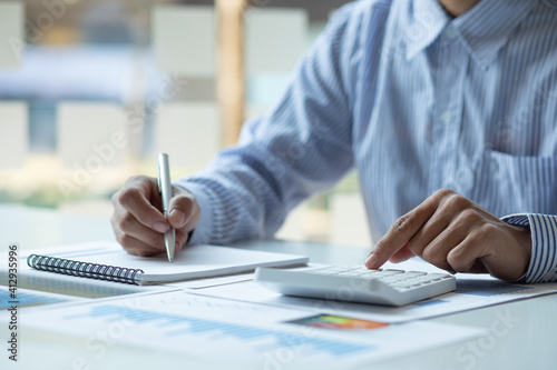 Financial Businessman analyze the graph of the company's performance to create profits and growth, Market research reports and income statistics, Financial and Accounting concept.