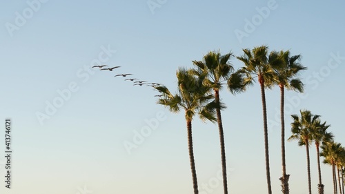 Big pelican birds flying, pelecanus flock soaring in sky, large wingspan. Palm tree in Oceanside, California waterfront pacific ocean tropical beach resort, USA. Summertime sea coastline vacations.