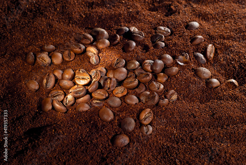 Coffee beans close up. Texture of ground and grain coffee. Contrasting dramatic light as an artistic effect.