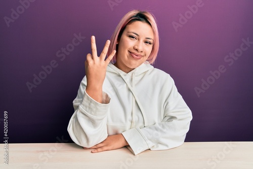 Hispanic woman with pink hair wearing casual sweatshirt sitting on the table showing and pointing up with fingers number three while smiling confident and happy.