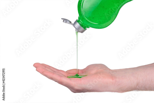 Dishwashing liquid is poured into an open palm on a white background.