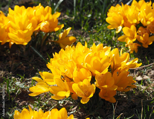 close up a bush of small yellow crocus flowers grows in the garden in sunny spring side view