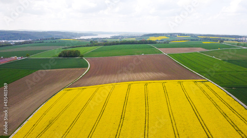 flowering fields of rapeseed with a lake in the background - drone image