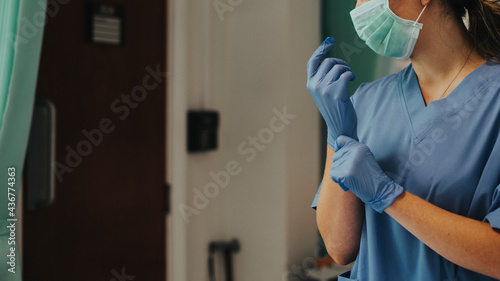 Doctor putting on a glove to prevent coronavirus contamination